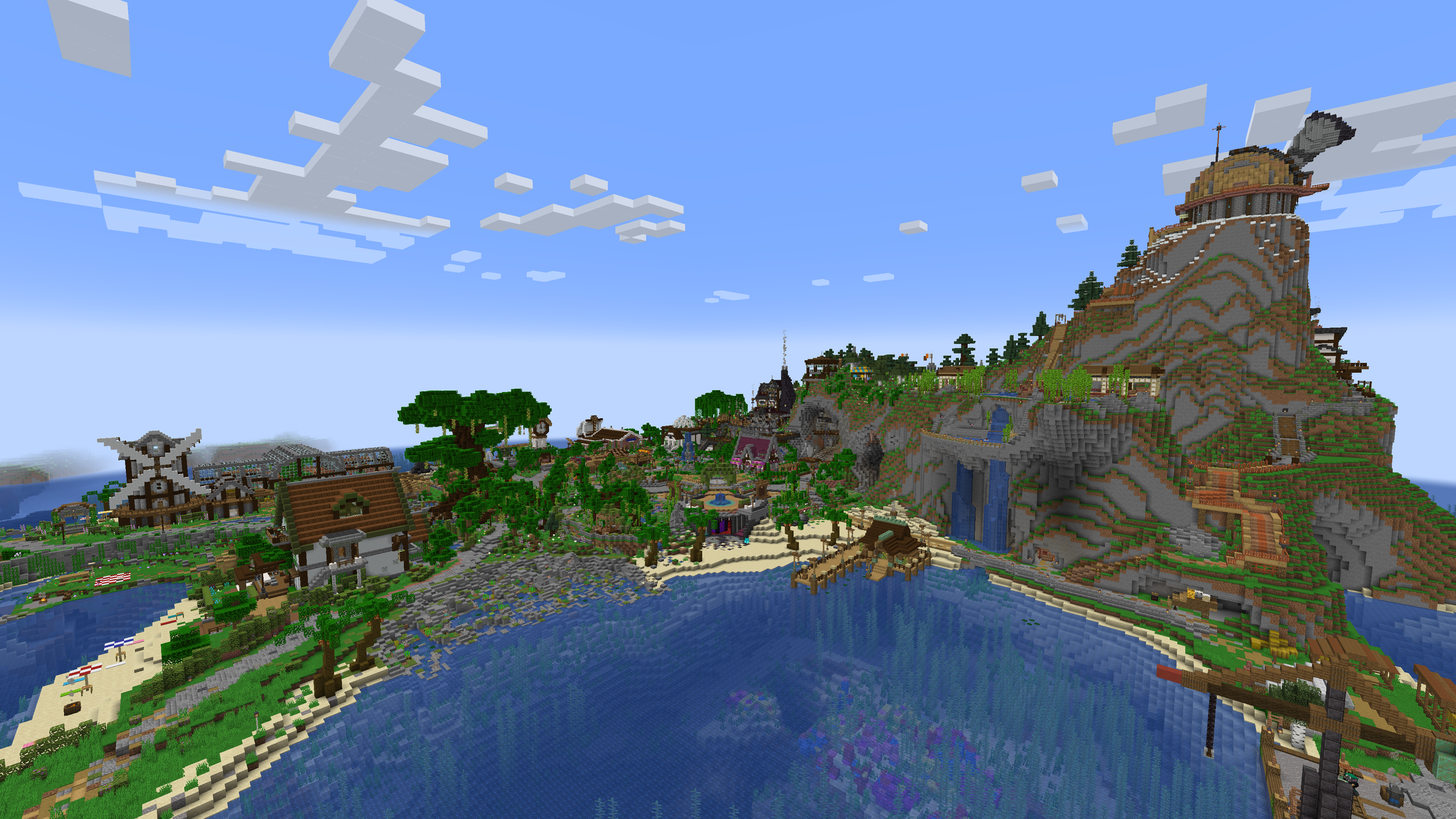 Located at spawn in the overworld, this large island is decorated with a wide spectrum of humble builds upon custom terrain.
